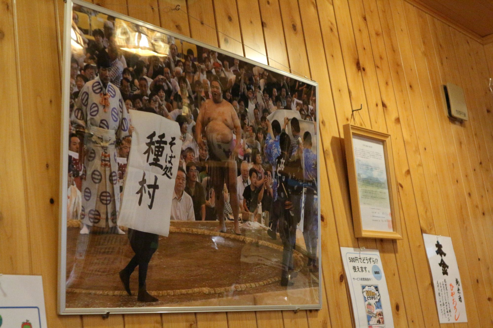 店内は、御嶽海写真や手形・掲載新聞記事など沢山飾られているのは、種村さんの奥様が御嶽海の従兄弟で応援しているからです。