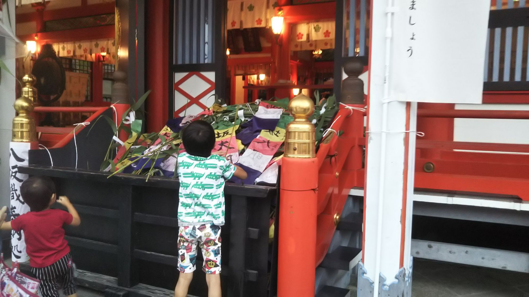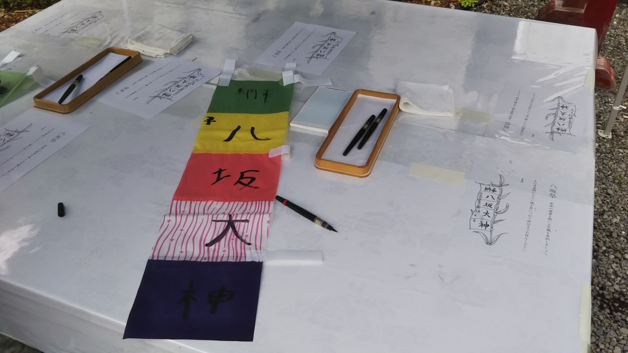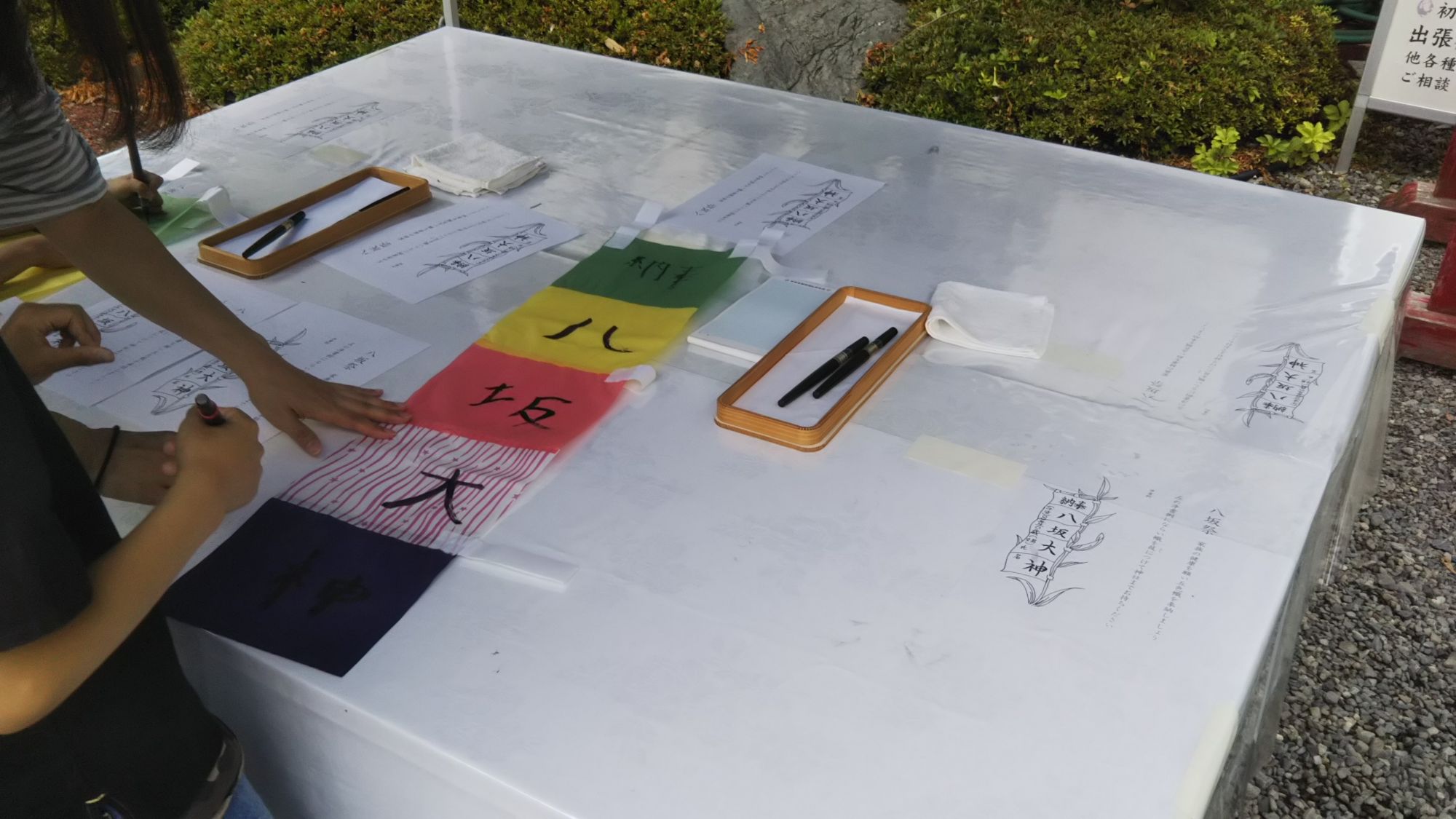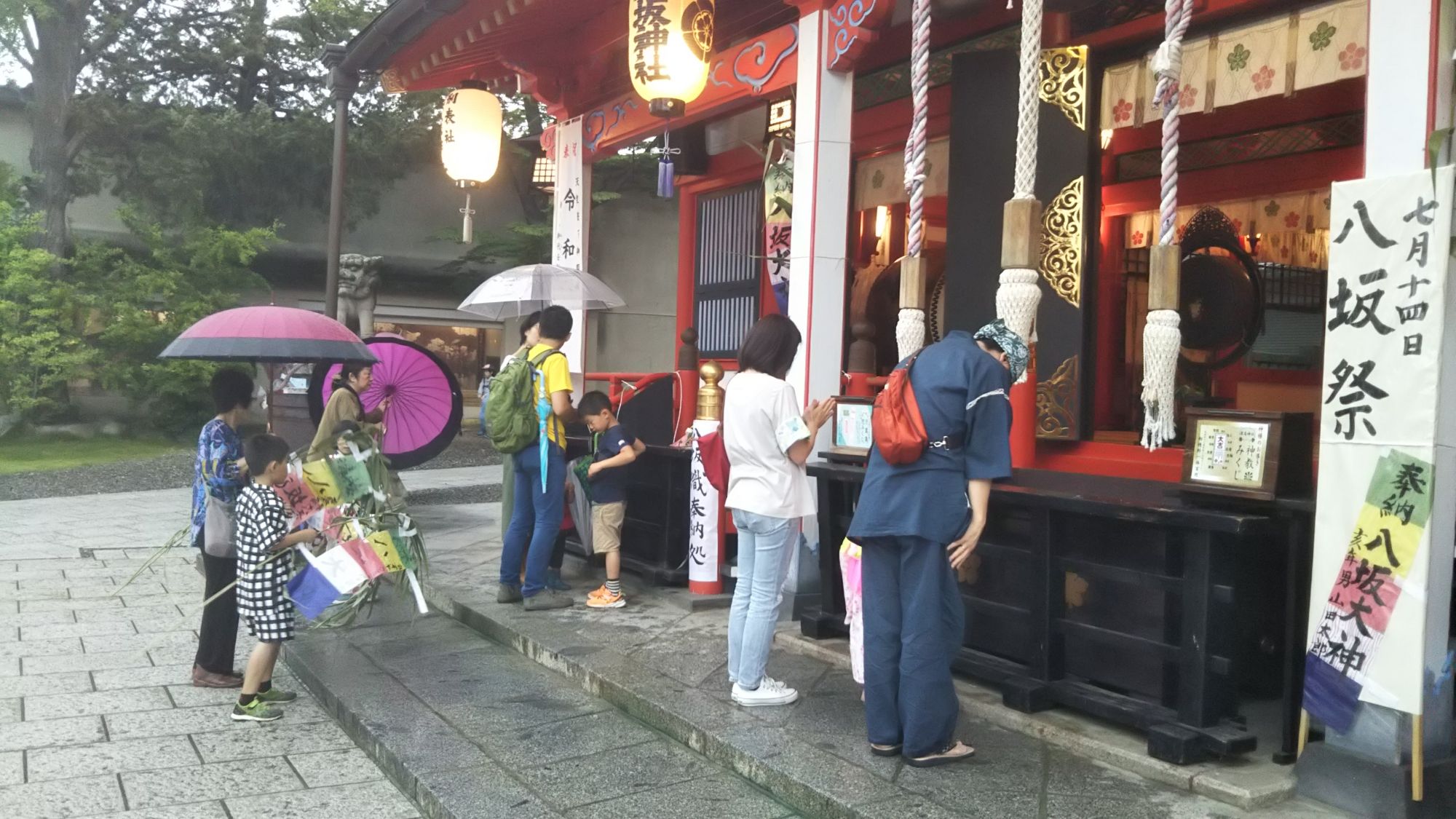 Traditionnellement à destination des enfants, cette fête a évolué avec le temps et de nos jours, ce festival est célébré par l’ensemble des habitants de la ville, petits et grands. Ce jour-là, les habitants achètent une bannière composée de 5 couleurs différentes et où l’on écrit le nom du Dieu Yasaka Sama en gros sur la bannière puis, à gauche en plus petit, la date de naissance et le nom de la personne faisant le rituel. Une fois la bannière remplie, on pose cette dernière devant le temple puis une prière est effectuée.