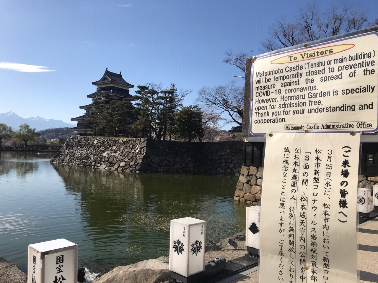 В связи с пандемией короновируса замок Мацумото, как и другие достопримечательности города, закрыт на неопределенный срок. Но вход на призамковую территорию открыт. Лишь редкие прохожие заходят взглянуть на удивительное зрелище – пустынный цветущий сад при замке.