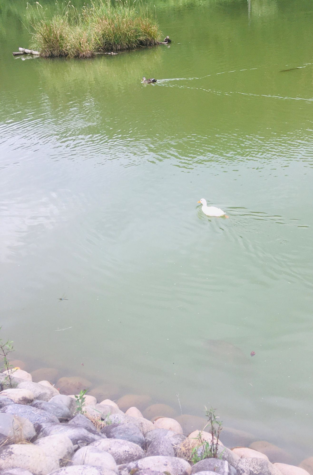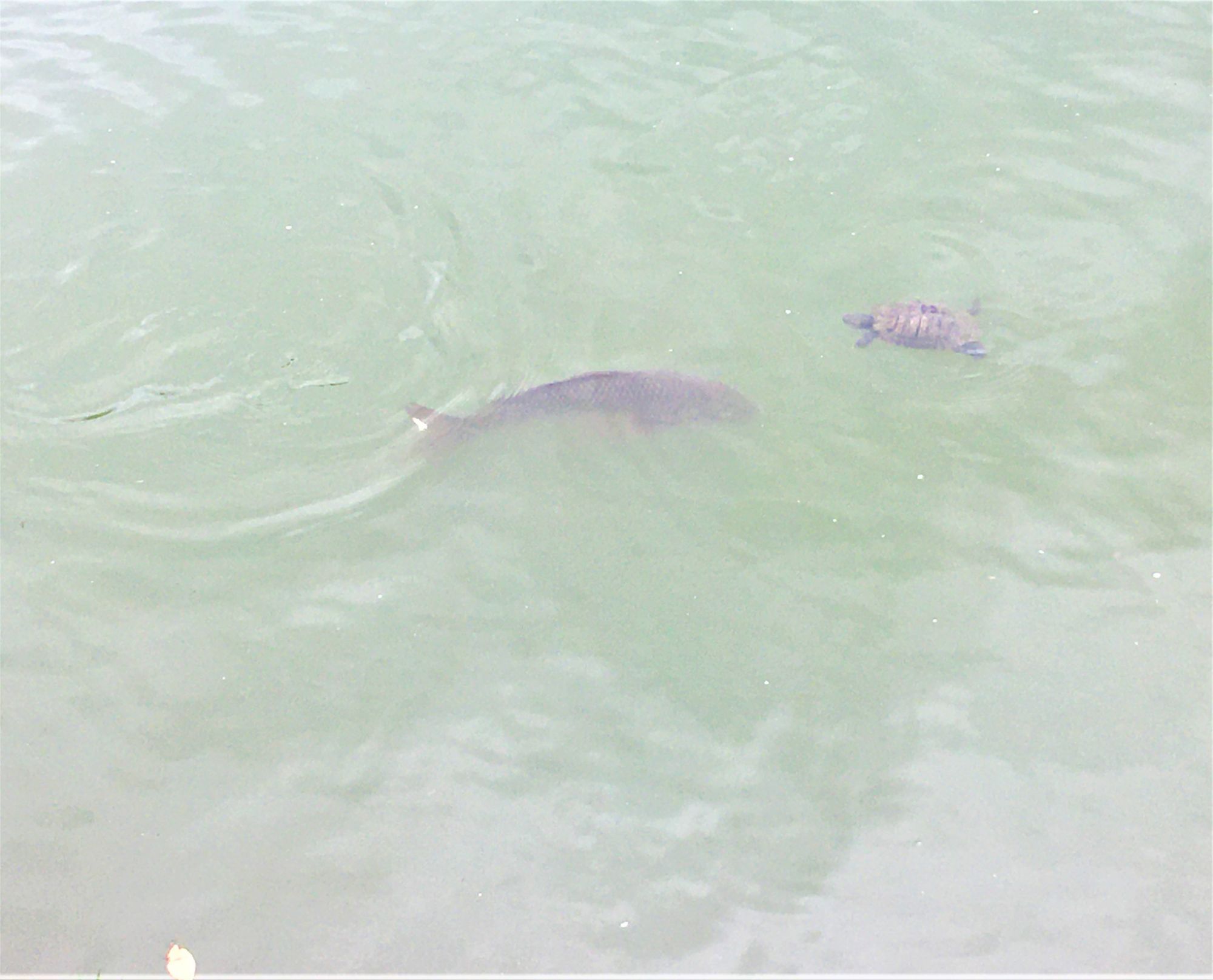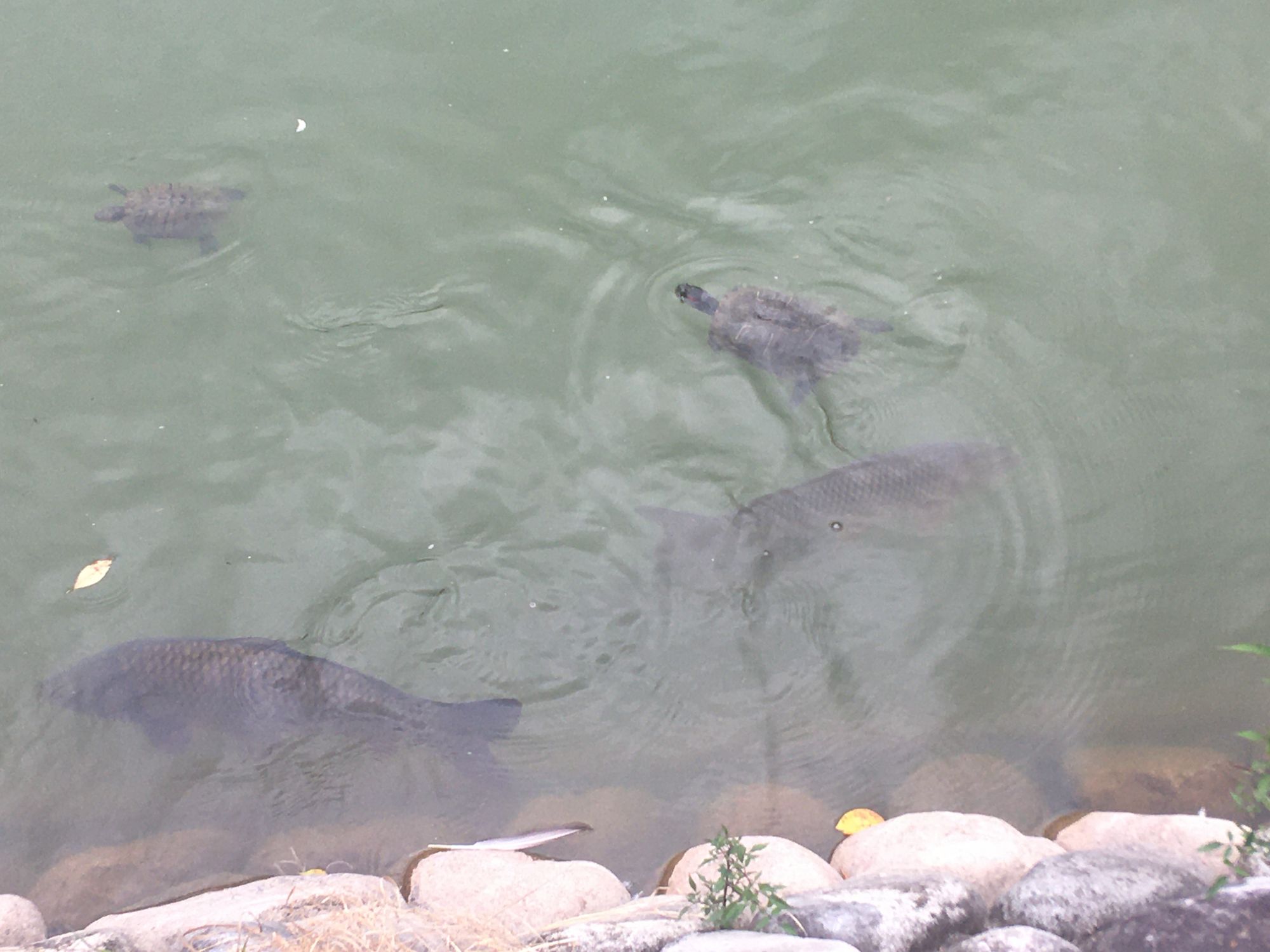 Der Teich beherbergt Wasserschildkröten, viele Enten und noch mehr Koi-Karpfen und wenn man Glück hat sieht man auch Reiher und Eisvögel.
