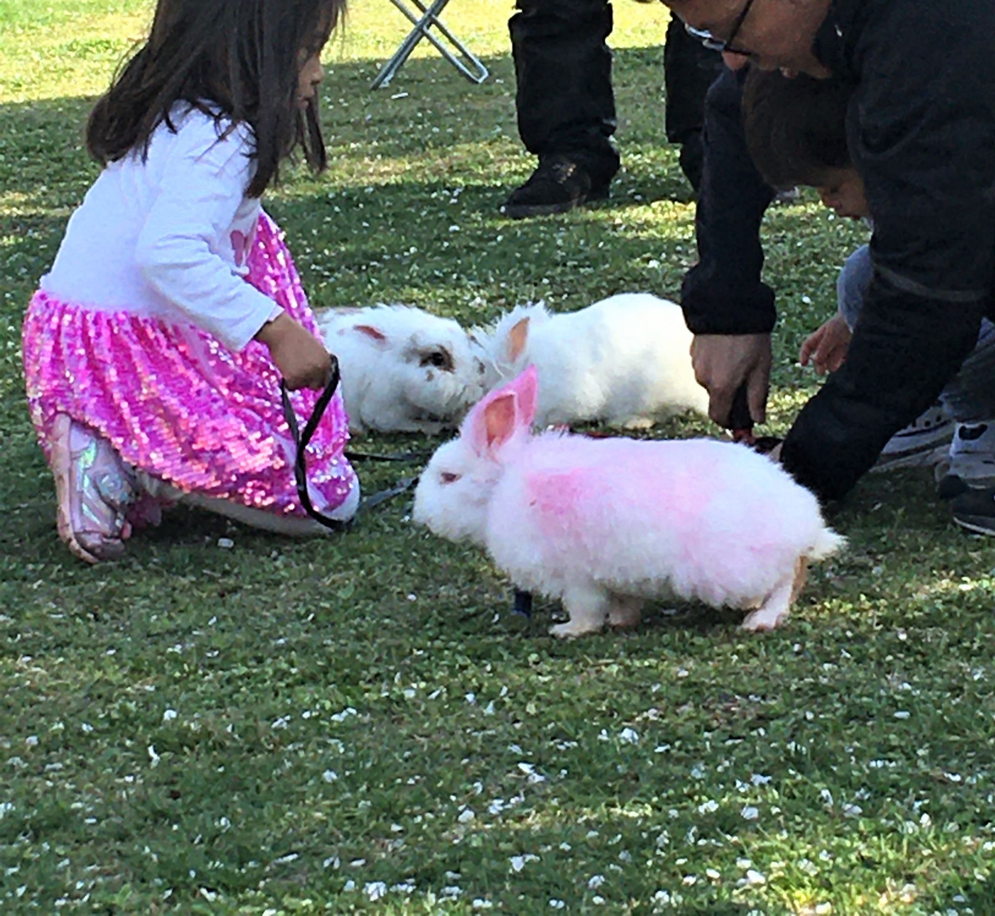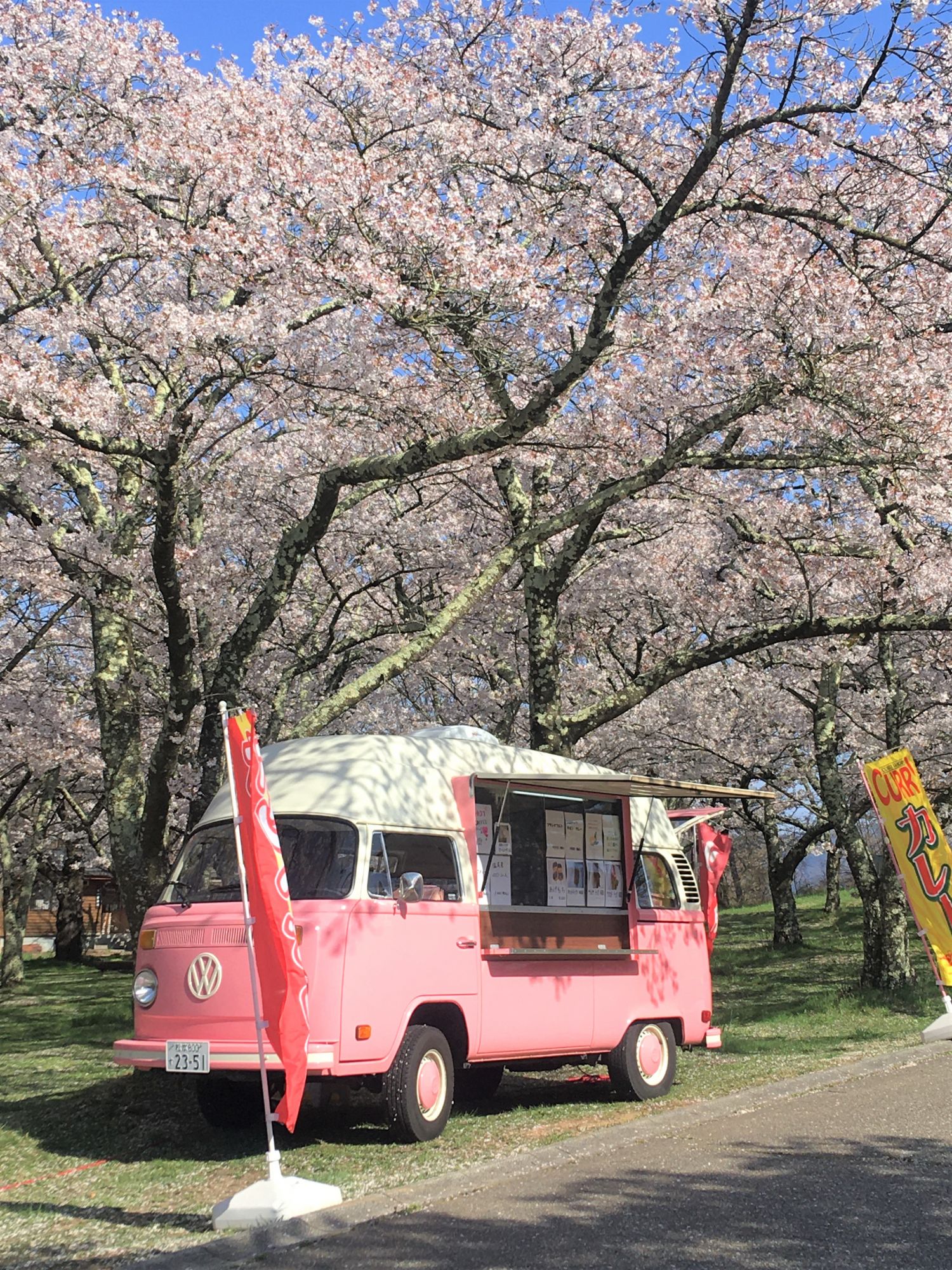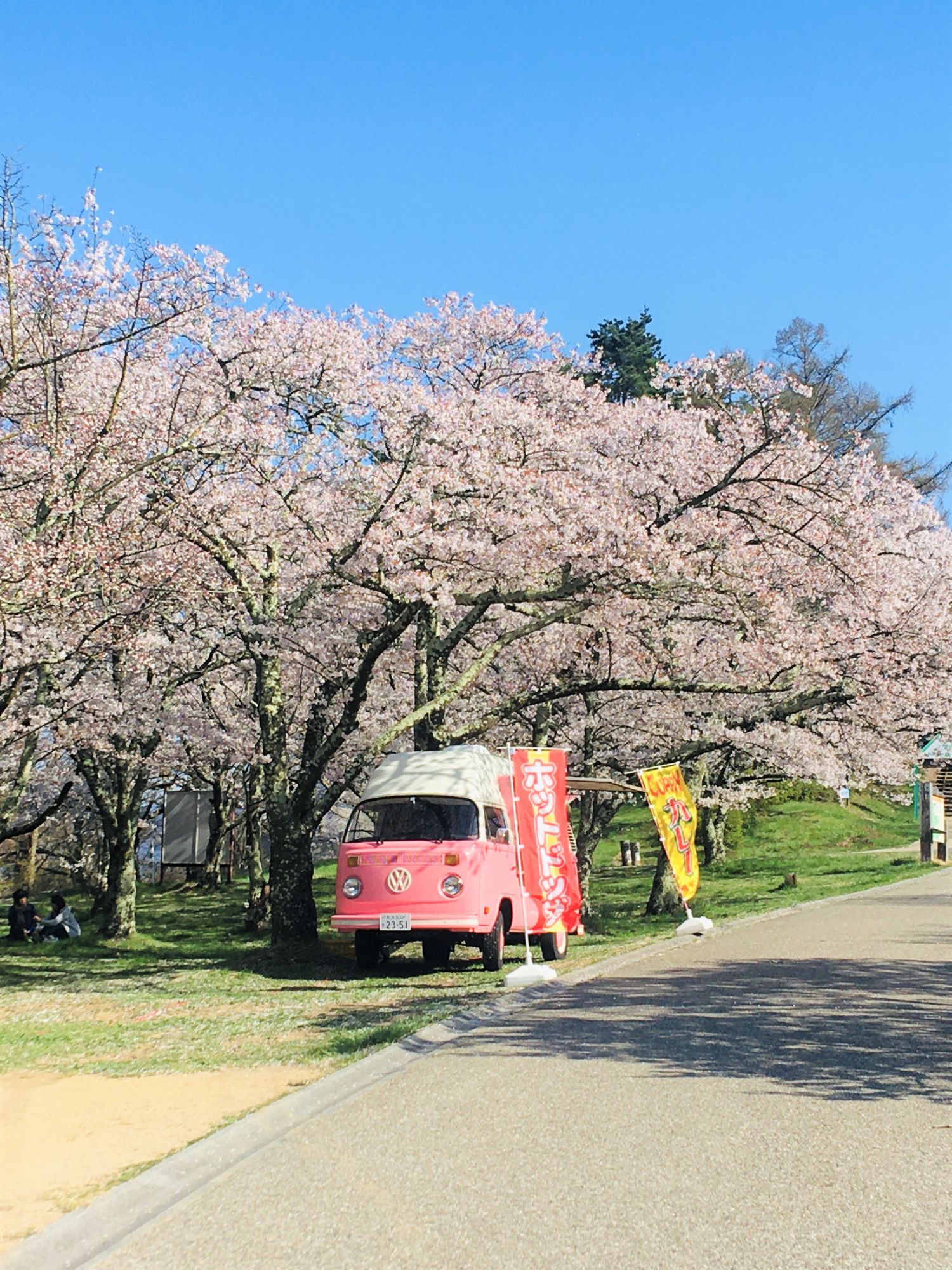 Perfekt getarnt im Kirschblüten-Teint ein rosa VW-Bus und, moment, ein rosa Hase!?