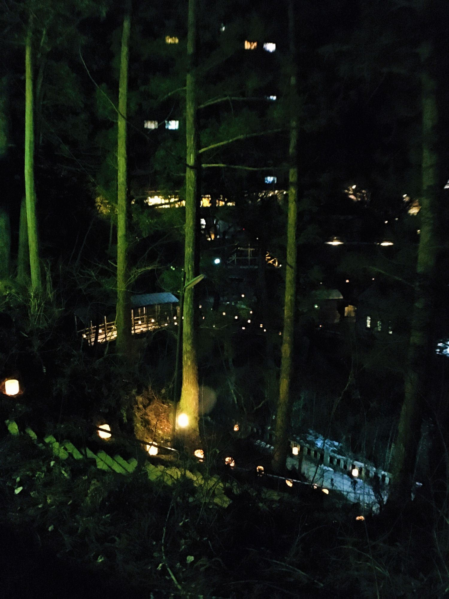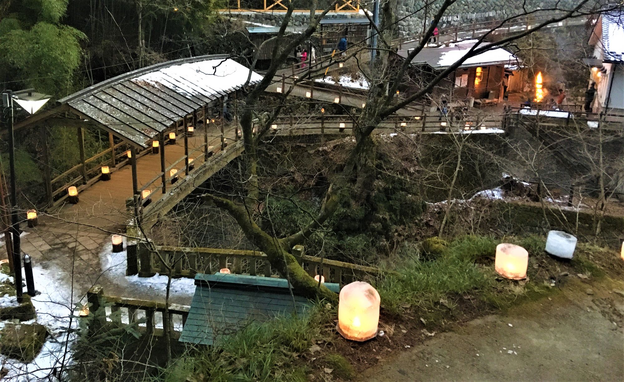 Ein Lichtermeer aus Eiskerzen in idyllischer Kulisse: Eine Holzbrücke, ein Bächlein, Tempel die golden und grün vom Hügel hinab leuchten.