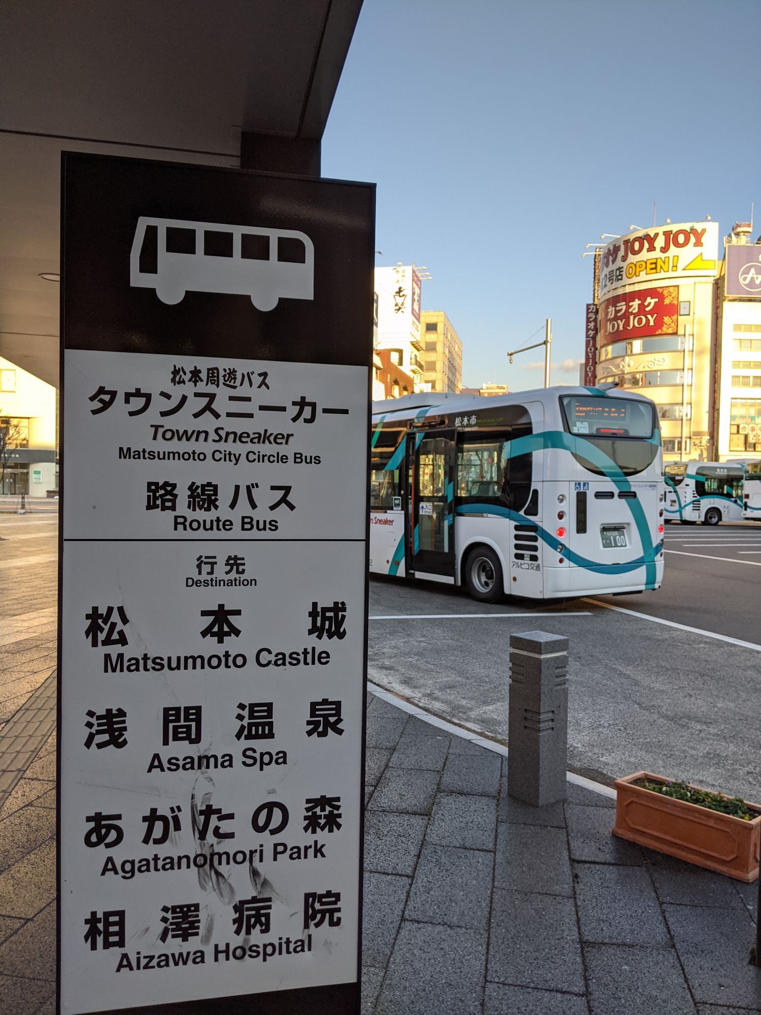En prenant la sortie Est, de nombreux bus vous amèneront dans les différents sites touristiques de la ville. Vous trouverez également des taxis. Néanmoins, et peut être à l’exception des sources thermales d’Asama Onsen, la ville se parcoure facilement à pied (le Château de Matsumoto est à seulement une vingtaine de minutes à pied). Vous pourrez également louer des vélos pour parcourir la ville plus aisément.